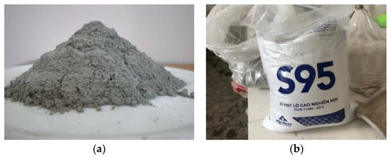 The fly ash (FA) used in this study is F-class, which was collected, dried, and packed from a local thermal power plant in Vietnam (Figure 2a). The granulated blast furnace slag (GBFS) was finely ground, dried, and packed from a local steel factory in Vietnam (Figure 2b). Both materials were tested for chemical composition and particle size before being used. The analysis results of the fly ash and blast furnace slag samples showed that these materials satisfy the requirements of EN 196-1 [31]. Table 1 lists the physical properties and chemical composition, while Figure 3 presents the XRD analysis results of the FA and GBFS.