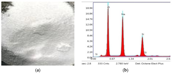 Crystalline hydrated sodium silicate salt with a density of 2410 kg/m3 and the SiO2/Na2O composition ratio by mass of 2.1 was used as a one-part alkali-activator. The image and XRD analysis result of solid crystalline one-part alkali-activator are shown in Figure 4. Crushed stone with a grain size of 5–10 mm and river sand were used as the coarse and fine aggregate materials. The physical properties of stone and sand are presented in Table 2.
