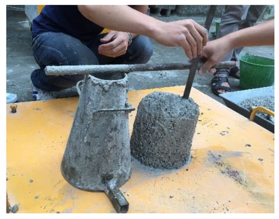 The workability of the GPC was evaluated by conducting slump tests for fresh one-part alkali-activated GPC according to the ASTM C143-78 [35]. The prepared fresh one-part alkali-activated GPC of each mixture was cast into three 100 mm × 200 mm cylindrical molds, and then the slump test was carried out, as illustrated in Figure 6.