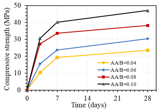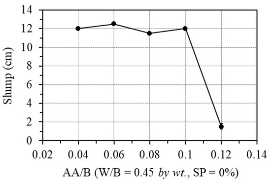 The effect of the one-part alkali-activator was examined by changing the AA/B ratio from 0.04 to 0.12, while the W/B was fixed at 0.45, and no superplasticizer was used. Figure 7 shows the effect of the one-part alkali-activator on the workability of GPC paste. As can be seen in this figure, when the percentage of the one-part alkali-activator was less than 10.0% of the binder weight, the workability of the GPC paste was unaffected. However, with the alkali-activator of 12.0% of the binder amount by weight (AA/B = 0.12), the workability of the mixture decreased very quickly, leading to the inability to cast specimens. The cause is that the polymerization reaction is exothermic; when the amount of activator is too large, it accelerates the evaporation time of water and immediately activates polymerization and calcium oxide reactions at the same time. These causes lead to the loss of GPC’s workability, as also indicated in the previous works [26,27,40,41].