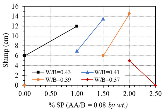 The effect of the superplasticizer was observed by changing the contents of this additive’s ratio from 0 to 2.5% of the total binder by weight (SP/B), while the AA/B was fixed at 0.08. Figure 9 shows the effect of the superplasticizer on the workability of GPC paste. It is seen that adding superplasticizers can greatly improve the workability of GPC. Indeed, for the mix proportion with a W/B ratio of 0.43, the slump of fresh GPC increased from 6 to 12 cm when the amount of superplasticizer was added to the mixture up to 1.0%. A similar trend was observed for the mix proportions with a W/B ratio of 0.41 and 0.39 when the added amount of superplasticizer increased from 1.0% to 1.5% and from 1.5% to 2.0%, respectively. The increase in slump with an increasing amount of superplasticizer could be due to the instability of the commercial superplasticizer in high basic media such as NaOH + Na2SiO3 [42]. In other words, according to Nematollahi and Sanjayan [30,42], the superplasticizer used in this study was chemically unstable in multi-compound activator (SiO2/Na2O = 2.1), and it experienced structural changes which resulted in the loss of their plasticizing characteristics. For the mix proportion with a W/B ratio of 0.37, due to the low amount of water, the superplasticizer just exhibited the effect on workability at a ratio of 2.0%. However, increasing the superplasticizer to 2.5% does not improve the workability. This value can be considered as the upper bound when using superplasticizer-based polyciliate for GPC.