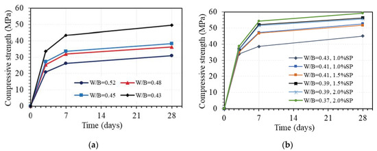 The effect of water via the W/B ratio on the compressive strength of GPC at different days of age is displayed in Figure 11. This figure shows that the W/B ratio has a great effect on the compressive strength of GPC. For GPC with the AA/B ratio of 0.08 and without superplasticizer, the effect is quite similar for strength values at 3, 7, and 28 days but much different from various ranges of W/B ratio, as shown in Figure 11a. Indeed, the compressive strength at 3, 7, and 28 days decreased by an average of 9.4%, 11.4%, and 11.5% per 1% increase in the W/B ratio when the W/B ratio was between 0.43 and 0.45, respectively. However, the corresponding average reduction values of compressive strength per 1% increase in W/B ratio when W/B ratio between 0.45 and 0.48 was very low of 2.3%, 1.7%, and 1.8%, whereas higher values of 4.3%, 4.4%, and 3.7% were observed for mean reduction values of compressive strength at 3, 7, and 28 days per 1% increase in W/B ratio when W/B ratio between 0.48 and 0.52, respectively. Further, the compressive strength at 3, 7, and 28 days similarly decreased by 37.5%, 39.5%, and 37.8% when the W/B ratio increased from 0.43 to 0.52, respectively. This effect may be attributed to the following two causes. Firstly, reducing the amount of water leads to the reduction of excess water, which is one of the main causes of the formation of voids in GPC. Secondly, the H2O/Na2O ratio decreases when the amount of water is reduced, leading to an increasing pH level. These phenomena lead to an increase in the compressive strength of GPC, which was also pointed out in the previous works [43,44,45].
