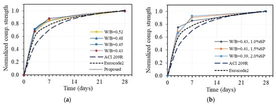 For the purpose of comparison, the relationship between compressive strength at t days and 28 days of age is normalized to the strength value at 28 days. Figure 12 shows the development of normalized compressive strength under the time of GPC in the case of without superplasticizer (Figure 12a) and with added superplasticizer (Figure 12b), where the strength at 28 days of GPC is taken as 1.0. The corresponding curves drawn from prediction equations given by two common codes, Eurocode2 and ACI 209R, for OPC concrete are also plotted. As can be seen in Figure 12a, the development curves of compressive strength under the time of GPC using different W/B and no superplasticizer are almost identical, which proves that the compressive strength development of GPC follows a very stable trend, as well as the experimental results in this study, are highly reliable. However, at an early age, the compressive strength values of all specimens were slightly higher than the predicted values based on Eurocode2, while they were quite much higher than the ones obtained from ACI 209R for OPC concrete. It was reported in the previous work that the fly-ash-based geopolymer concrete with specific temperature and time-curing conditions achieves high early compressive strength due to the fast hydration reaction [40]. Moreover, the fast setting time and high early compressive strength of alkaline-activated slag concrete due to the presence of high CaO content have also been shown in many other studies [43,48,49,50]. The obtained results in this work are consistent with the previous studies and could be used to investigate the creep and shrinkage properties of one-part alkali-activated GPC.