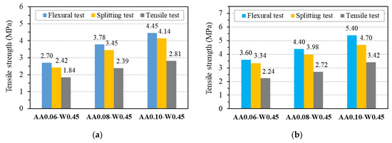 Tensile strength of GPC: (a) at 7 days; (b) at 28 days.
