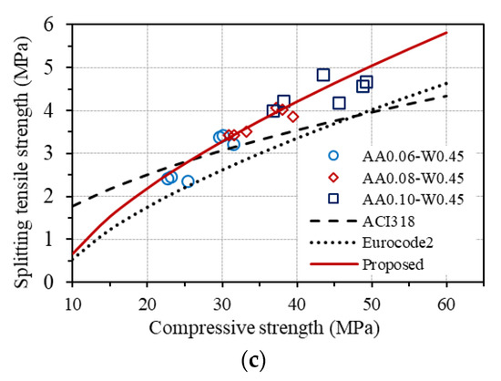 From the proposed equation, splitting tensile strength can be predicted from the compressive strength of GPC using the relationship between Equations (8) and (12), which is also plotted in Figure 14c, showing good agreement with the experimental results of splitting tensile strength of GPC.