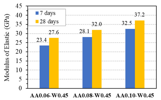 After compressive strength tests had been carried out, three mix proportions, AA0.06-W0.45, AA0.08-W0.45, and AA0.10-W0.45, showed the compressive strength of about 30 MPa, 40 MPa, and 50 MPa were chosen to investigate the tensile strengths, modulus of elasticity as well as their relations with compressive strength of GPC. It should be noted that the three chosen mix proportions do not contain superplasticizers in order to be able to evaluate the relationship between the tensile strengths and modulus elasticity with compressive strength of pure one-part alkali-activated GPC. Figure 13 presents the results of the mean tensile strength of GPC from three specimens at 7 and 28 days with different testing types, including flexural, splitting, and axial tensile tests, which are also summarized in Table 6, together with their coefficient of variation.