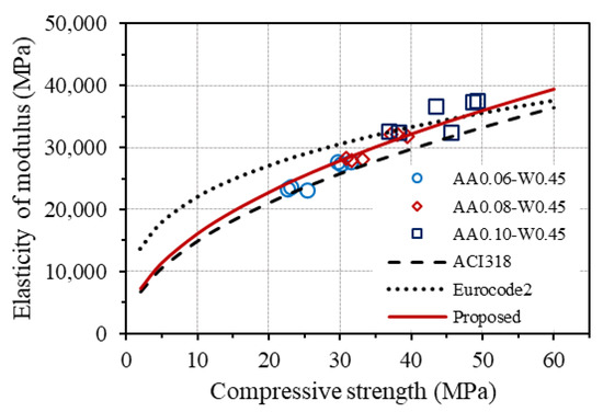 Figure 16 displays the curves drawn from the equations for estimating elastic modulus from the compressive strength of concrete provided by ACI 318 and Eurocode2, together with the measured elastic modulus of GPC. As seen, although the trend of the curve given by ACI 318 is relatively consistent with the experimental results of GPC, the prediction equations from both codes do not agree well with GPC. Based on that, a modification of the original equation from ACI 318 was made to fit the experimental results, as follows: