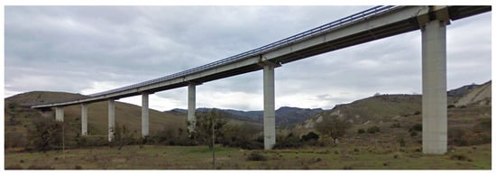 This study focuses on bridges along the highways of the Basilicata region. Highways are also called “state roads”, connecting the main towns of a region and across more than one region. They are very important to the Basilicata region, which has a scarce presence of motorways and trunk-type roads []. Along Basilicata highways, bridges are mostly multi-span simply supported girder deck type, similar to the viaduct shown in Figure 1.