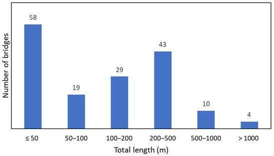 Figure 3 shows the distribution of the number of bridges based on total length intervals. Most structures are multi-span bridges having length values under 500 m.