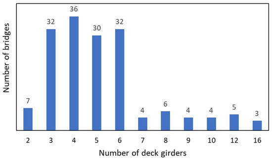 Figure 4 shows the total number of bridges distributed according to the different numbers of deck girders, which are defined based on the data reported in the database. It is observed that bridges with 3, 4, 5, and 6 girders have the highest number of occurrences. This condition justifies the choice of using these four values as the number of girders in the statistical analysis.