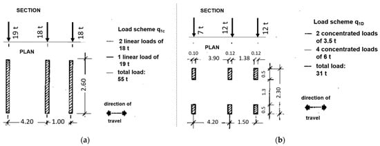Figure 6. (a) Three-axle trailer with a total weight of 55 tons; (b) Three-axle truck with a total weight of 31 tons (dimension units in meters). - q1D is a three-axle truck (point loads) weighing 31 tons (Figure 6b);