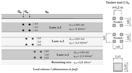To carry out the Level 3 assessment according to the guidelines, a comparison based on traffic loads related to different regulations is conducted. In this study, the current code, namely the Ministerial Decree of 17 January 2018 “Technical Standards for Construction” [], is compared with the following codes: