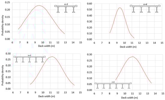 It is worth noting that deck width values for n = 5 are slightly larger than those for n = 6. This means that decks with 5 and 6 girders can be considered almost equivalent.