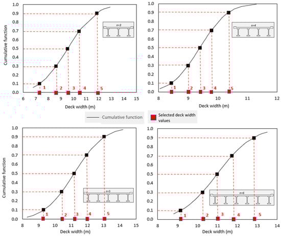 - Definition of the mean line corresponding to the centroid of each interval, i.e., for the values 0.1–0.3–0.5–0.7–0.9 of the cumulative function, and determining their intersection with the cumulative density function and, then, with the horizontal axis to determine the deck width values (Figure 11).