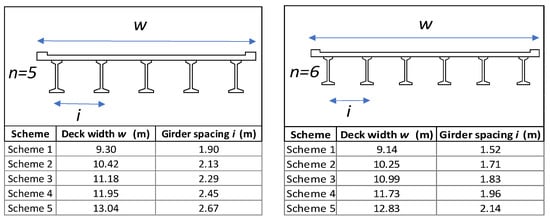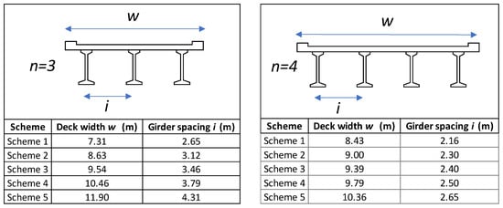 At the end of the statistical analysis, five girder deck schemes (red squares in Figure 11) are obtained for each of the four values of n, which are subsequently analysed considering four values of the span length L (20, 30, 40, 50 m). Therefore, a total of 5 × 4 × 4 = 80 configurations is obtained (Figure 12).