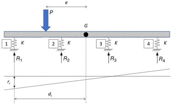 Then, the procedure of traffic load transverse distribution is performed, using the Courbon Engesser method []. By calculating the transverse distribution coefficient ri (4) the portion of the traffic load P transmitted to the longitudinal girders, constituting the girder deck configurations, is determined (Figure 13).