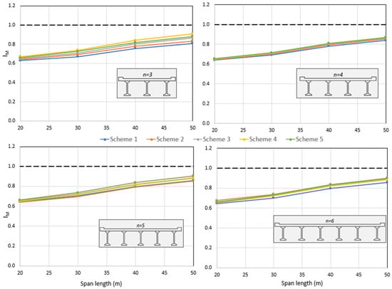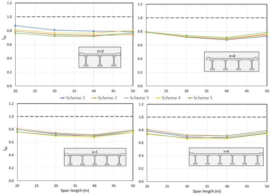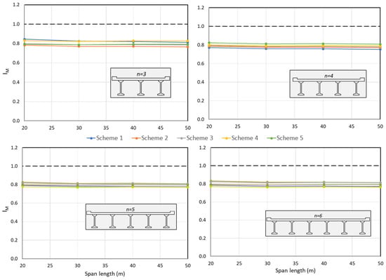 The performance gap of bridges designed according to the regulations in force at the time of their design is highlighted when applying the traffic load models specified in the current regulations used for designing new structures. The dimensionless performance indices are represented through graphs, where the span length of the deck is plotted on the x-axis and and values on the y-axis (Figure 14, Figure 15, Figure 16, Figure 17, Figure 18 and Figure 19).