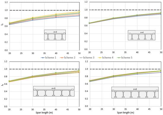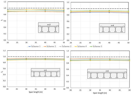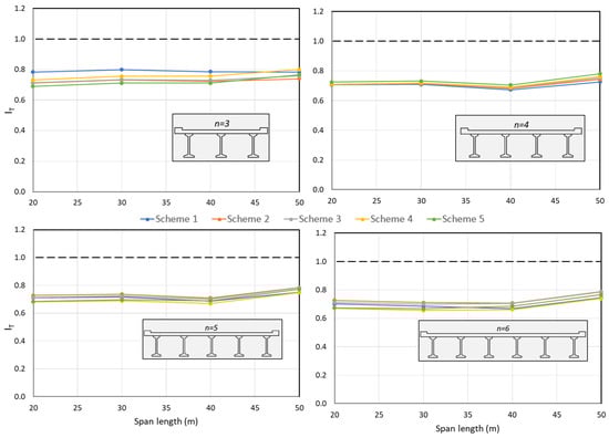 Indeed, is the average of the 10 performance index values computed considering the five deck schemes (s = 1 to 5) for the span length values equal to 30 and 40 m. The choice of these two span length values depends on the observation that most simply supported bridges in Italy have a mean span length of around 33 m [], which is in the range of 30–40 m.