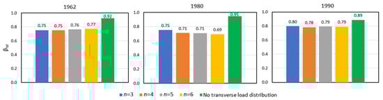 Regarding Level 3, which involves the preliminary assessment of the bridge’s capacity, less research is available. For example, a study by Buratti et al. [] was based on a parametric analysis to demonstrate the variation in bending stress values considering both old standards and the traffic loads specified in the current regulation. Simplified initial assumptions were made in the study. Deterministic girder deck models were assumed for the parametric analysis, considering four different values of roadway width and four values of span length. The transverse load distribution procedure was not implemented and, consequently, the proportion of traffic loads transferred to each girder was not defined. This corresponds to the assumption that the bridge is made up of a single girder.