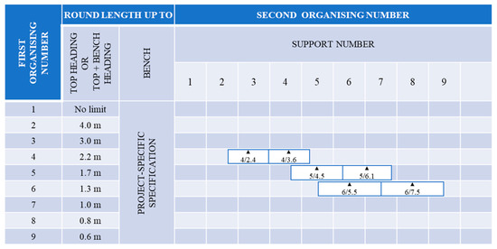 Compared to the FIDIC Emerald Book, ÖNORM B 2203-1 takes systemic conditions and tunnelling classes as the basis for project planning and remuneration. In projects based on the ÖNORM B 2203-1, the stakeholders have to agree upon documentation and invoicing procedures, which are conducted according to the respective tunnelling classification matrix before the start of construction [54], as exemplified in Figure 2. The ÖNORM B 2203-1:2022 definition of the tunnelling classes comprises the first organising number, determined by the specified round length, and the second organising number, calculated from the extent and the type of the supporting measures [62]. All supporting measures installed in the specified cross-sections are to be considered. The tunnelling classes are further ordered for the excavation work, required methods of loosening, a subdivision of the partial cross-sections, and the excavation sequence. The definition and distribution of planned excavation classes allow the Client to more precisely estimate the cost of a given tunnel project based on the geological qualities of the project region. The evaluation area is contractually fixed and independent of actual settlement lines [54]. The application of unit prices and advance rates in the context of the discussed methodology involves their utilisation within specific areas defined by the cut-off length, the first organising number (depicted on the left side of Figure 2), and the region encompassed by the second organising number (visible in the upper part of Figure 2). The determination of the first organising number is contingent upon the length of excavation, whereas the calculation of the second organising number relies on the summation of evaluated support means per metre of the tunnel, divided by the evaluation area. The duration of constructing each tunnel section is also a variable that influences the final invoicing.
