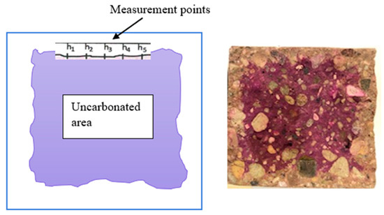 The accelerated test of resistance to carbonation of concrete was carried out according to the procedure given in EN 12390-12:2010 “Testing hardened concrete—Part 12: Determination of the potential carbonation resistance of concrete: Accelerated carbonation method”. The test was carried out on samples measuring 500 × 100 × 100 [mm] [59]. The test samples matured in water for 28 days, then for 14 days the mass stabilized under conditions of relative humidity of 60 ± 10% and temperature of 21 ± 2 °C. The measurement of the depth of the carbonation front took place after 56, 70, and 90 days from the concentration of samples in the carbonation chamber at CO2 = 4%, temperature t = 20 °C +/− 2 °C, and relative humidity RH = 50–60%. To measure the carbonation front, made on the exposed, fresh surface of the sample, a phenolphthalein solution with a ratio of 1 g phenolphthalein to 70 g of ethyl alcohol was used, then diluted in 30 g of distilled water. The depth of carbonation is measured by applying a phenolphthalein index to the surface of the fresh break of the sample. Cubic samples had to be broken in half, perpendicular to the unparaffin-protected surfaces. The depth of carbonation is the average depth measured at 5 points on all 4 sides with an accuracy of 1 mm (Figure 1).