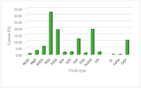 Based on the results, it was found that the ash samples met the requirements of EN 450-1:2012 [32] regarding CaO and reactive CaO content. The variability of CaO content in fly ash was low at −0.08% by mass (limit value is −1.6%) and reactive at −10.89% by mass (limit value less than 11% by mass). A higher active calcium oxide content affects the hydraulic properties of the ash and the formation of the C-S-H phase. In addition, the content of active silica in sewage sludge ash does not meet the standard requirement (the lower limit is 25% by weight)—15.24%. The result shows a volatility of 88%. The total SiO2 content was −32.21% by mass, with a deviation of 58%. Considering that the basic oxides for making cement clinker are: CaO, SiO2, Al2O3, and Fe2O3, there is no requirement for the total content of the three oxides (SiO2, Al2O3, Fe2O3). Examination of ash samples from the thermal treatment of sewage sludge showed a dispersion of −57.71% by weight. Considering ASTM-C618-03, the ash content of Krakow WWTP meets the requirements for the sum of oxides (SiO2, Al2O3, Fe2O3 ≥ 50%) [56].