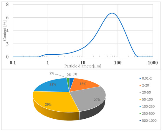 The loss on ignition (indicating the amount of unburned carbon in the fly ash sample) is significantly lower compared to quartz ash currently used in concrete technology. This is due to the combustion technology of the fluidized bed furnace and the higher combustion temperature of more than 850 °C. The loss on ignition of ash in sewage sludge was 0.7% by weight. According to the standard, these values correspond to class A. The slight variation in the obtained results indicates the stability of the municipal sludge incineration technology. A characteristic feature of the ash from the thermal treatment of sewage sludge is a high phosphate content, which exceeds the limit for individual results (less than 5.5% by weight) by three to five times. The phosphate content was −18.91% by weight. This is due to the removal of phosphorus from municipal wastewater and its accumulation in sewage sludge. The particle size distribution of the tested fly ash showed a unimodal distribution with a maximum value of 65 μm. Particles with a diameter of 2–250 μm accounted for more than 91% of the volume. The dominant grain fractions in this range are 20–50 μm (27.25%), 50–100 μm (29.39%), and 100–250 μm (22.89%)—Figure 3. The specific density of ash was—2.780 kg/dm3.