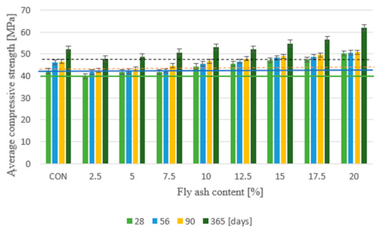 3. Concrete containing more than 10% sewage sludge fly ash instead of cement was characterized by higher compressive strength than the control concrete without the additive. The mean compressive strengths of Krakow ash-bearing concrete after curing for 28, 56, 90, and 365 days were 50.1 MPa, 50.6 MPa, 50.8 MPa, and 61.9 MPa, respectively. As a result, the strength properties of the concrete were able to achieve a strength of 25 MPa above the minimum value set during design.