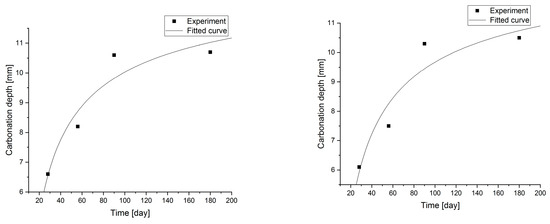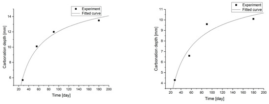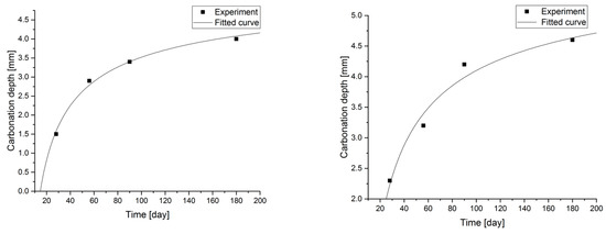Statistical methods (Statistica 10) for carbonization model analysis using carbonation depth studies up to 180 days. The models are presented graphically (Figure 7, Figure 8, Figure 9 and Figure 10) and are listed in Table 2 together with correlation coefficients and carbonation depth maxima (asymptotes of the model).