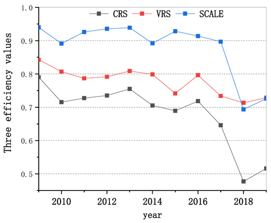 To foster the development of the central and western regions, the government has implemented policies that aim to enhance their overall economic and technological levels. These policies have involved increased investments, promotion of industrial upgrading, and technological innovation. By comparing Figure 2a,b, we can observe that the comprehensive technical efficiency of the central and western regions primarily relies on scale efficiency during this period. This suggests that the lower CSP in these regions can be attributed to insufficient capital investment and a relatively backward technology level.