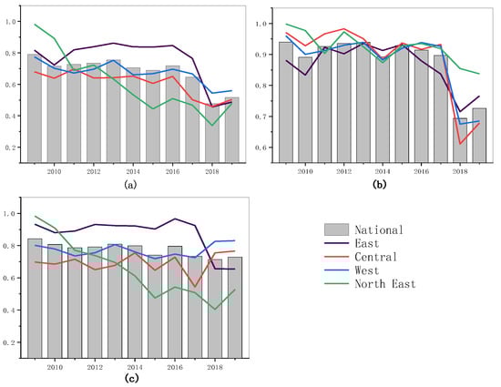 Trend graph of the three performance values by region: (a) Mean technical efficiency values, (b) Mean scale efficiency values, (c) Mean value of pure technical efficiency values.