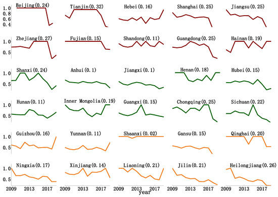 Using Maxdea8.0 software, the CSP values of 30 provinces and cities in China, excluding environmental and RF, were obtained. The calculations include total efficiency (TE) and its components (PTE and SE). Figure 3 shows the trend of CSP for each province and city from 2009 to 2019. In terms of the overall performance of construction safety, the top three provinces in terms of average CSP from 2009 to 2019 were Shaanxi Province (0.9925), Fujian Province (0.93359), and Qinghai Province (0.88). Meanwhile, Shaanxi Province has maintained a level of about 1 since 2009, which is consistent with the results of related studies [26,31], but there are many other provinces with safety performance values below 0.6. It can be seen that there are large differences in CSP among regions.