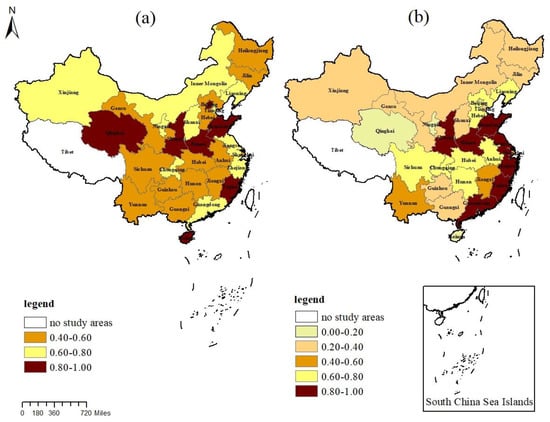 Spatial distribution of building construction safety levels in China’s provinces: (a) phase I, (b) phase III. Note: The modified map is based on the standard map GS (2019) No. 1822 downloaded from the standard map service website of the National Administration of Surveying, Mapping and Geographic Information of China, without any modification.