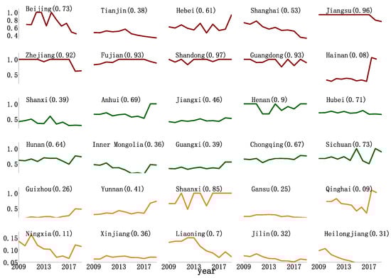 This section will further analyze the regional divergence characteristics of building CSP in China. In terms of the four regions of East, Central, West, and Northeast, the more economically developed Eastern region had a much higher CSP than the other three regions from 2009–2017, while the overall technical efficiency and pure technical efficiency of the other regions were almost all lower than the national average. This shows an obvious unbalanced spatial distribution pattern of “East-West-Central”, which is similar to the results of Kang et al. [26]. However, after 2017, the building CSP in the western region is greater than the national average, and the pure technical efficiency in the central region is also higher than the national average after 2018, while the other three regions, including the east, are below the national average. The main reasons for this phenomenon are the following: