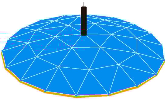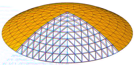 - Equal subsection surface division: On the projection plane, the sectors were equally divided with the segmentation of the ring rods. Subsequently, these segments were mapped back onto the sphere’s surface.
