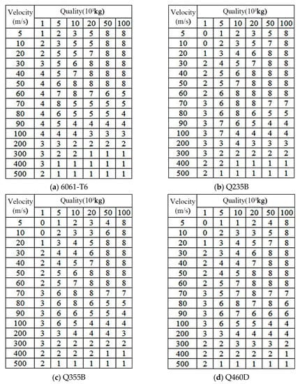- This paper mainly considered the ramifications of the monomeric high-speed impact on different materials, with the comparative analysis of the impact dynamic response of different materials, specifically focusing on the Kiewitt spherical net shell [31]. Through large-scale parametric analysis, we successfully obtained the impact failure mode distributions [32,33] of certain types of structural steel, including Q235B [34], Q355B, Q460D [35], as well as aluminum alloy 6061-T6 [36,37]. Furthermore, we summarized the change patterns of the failure modes of different structural steel [38] and compared the impact resistance of Q235B steel and 6061-T6 aluminum alloy, which eventually revealed the mechanism of impact dynamic response with typical examples, and provided a reference for the study of the shell structure under impacts.
