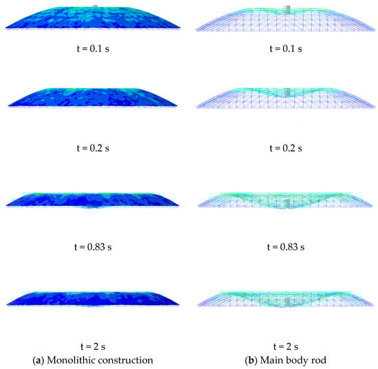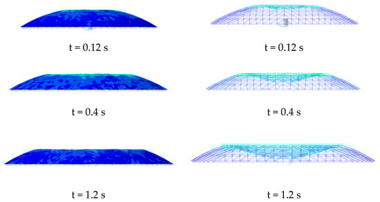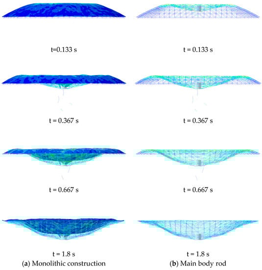 - Studying the influence of dynamic constitutive models on the numerical simulation of impact resistance of spherical net shells [24,25,26,27]. The influence of dynamic constitutive models on shell impact resistance numerical simulation was analyzed, with the consideration of the Cowper-Symonds [28] (C-S), J-C [29], MJ-C [30], and MxJ-C failure mode distributions of the shell impact failure models. Moreover, the impact action, node vertical displacement, and vertical velocity were evaluated by applying different dynamic constitutive models for the numerical simulation of the shell impact resistance. Finally, suggestions were provided for the selection of suitable dynamic constitutive models to capture the material’s impact dynamic response accurately.
