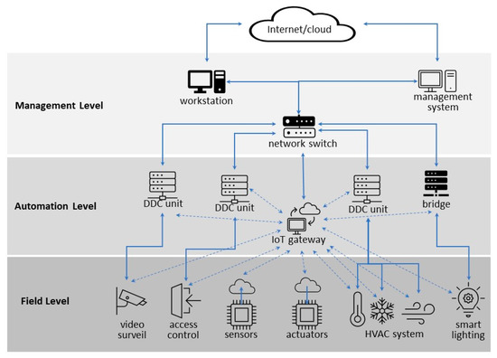 A building automation system mainly needs devices that communicate between them, with the user, and communication protocols. It is typically organized into three levels (Figure 2): field, automation, and management [3,16]. The field level interacts with the physical world, usually with sensors and actuators. At the automation level are developed control logic operations, by controllers, to execute appropriate actions. The management level is used by operators to monitor, configure, and control the whole system.