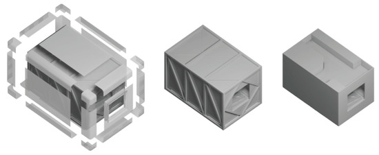 The capsule, inspired by the Kurokawa’s Nakagin Tower [25], is a prefabricated steel structure, clad in galvanized steel panels with an exterior waterproofing treatment. Conceived by injection molds, in order to reduce the joints, the manufacturing process involves the structural envelope design for a molded parts aggregation (Figure 3).