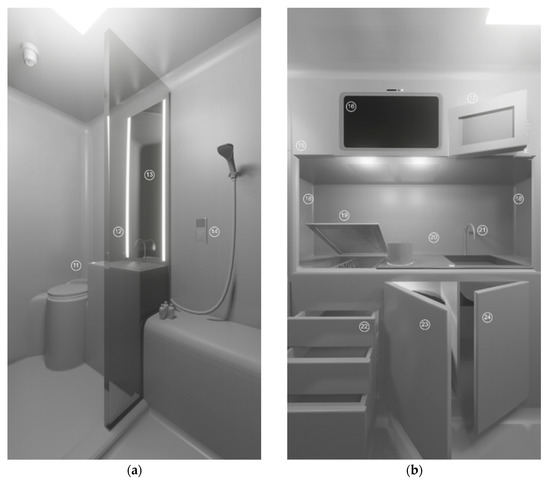The cooking area (Figure 8b) was for cooking meals and the cook robots were excluded. A solution was favored that attributes centrality to a kitchen hub (#16 in Figure 8b), which served as the main interface to the capsule. Meals could be cooked in a combined oven/microwave (#17 in Figure 8b) or on an induction cooker (#20 in Figure 8b). The stove had two surfaces with circular cutouts used as induction bases for cooking, another cutout used as a weighing scale, and a fourth as an induction charger. The adjacent area (#21 in Figure 8b) was occupied by a basin with an identical mechanism to the basin in the personal hygiene area. The dishwasher (#19 in Figure 8b) is built-in and accessible from the top of the workbench. The lower space of the bench contained storage for kitchen utensils (#22 in Figure 8b), and a smart fridge (#23 in Figure 8b) with the functionality of inventorying the items contained and communication with ordering services. There was also a space for waste disposal (#24 in Figure 8b). The side spaces of the workbench (#18 in Figure 8b) were equipped with smart electrical sockets for not foreseen equipment. These, as previously mentioned, allowed for the basic control of additional equipment that was not natively smart.