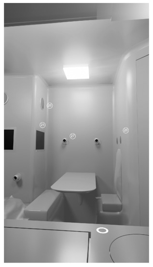 The work area (Figure 9) was multipurpose, as it fulfilled work, socializing, and meal functions. It was equipped with a screen (#25 in Figure 9) that served as a second monitor for the laptop used on the desktop. There were three sound columns (#26 in Figure 9) in the work area. One was located at the upper limit of the capsule, working together with the bedroom. The remaining two speakers were positioned on either side of the workstation user. There were also two HVAC system diffusers (#27 in Figure 9) on the side wall of the work area in order to contribute to general or zonal thermal control of the capsule.