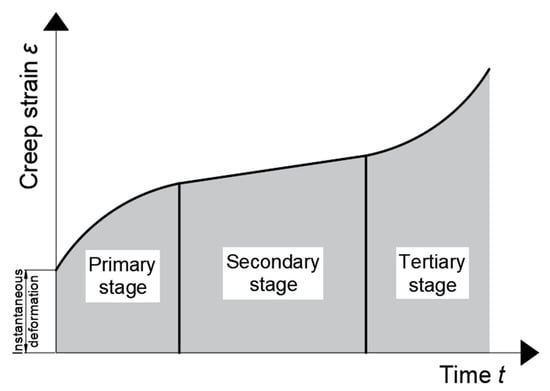 Nowadays, engineered wood products (EWP) have gained popularity due to their environmental and mechanical characteristics. However, the exposure of the EWPs to constant load induces a creep strain, sometimes followed by a structural failure. Therefore, the serviceability limit state is often a decisive criterion for structural design. Timber is a time-dependent and viscoelastic material that exhibits elastic behavior under lower stress levels []. The time-dependent behavior is investigated by means of creep as a slow continuous strain under constant stress. Creep behavior of generally used building materials can be described in three stages, with the initial deflection depending on the magnitude of loading. The initial deflection is usually considered instantaneous, combining elastic and delayed elastic deformation. The curve shown in Figure 1 represents creep strain in the time domain. The first stage includes a continuous strain increase at a slowing rate (primary creep); the second assumes a linear creep curve at an almost constant rate which at low temperatures and low load levels may stabilize; and the third stage, which is far less investigated, includes increasing rate and fracture.
