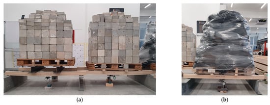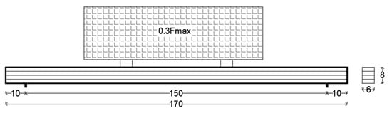 All specimens were kept in identical room conditions before performing tests. The tests were initiated in December 2022 and ended in June 2023 at the specialized laboratory unit of the Faculty of Civil Engineering, Architecture, and Geodesy, Split. Moisture content and density were determined before testing. Glulams were positioned symmetrically between supports made from stainless steel and loaded at two points with a constant load, as it is shown in Figure 2. For each surface treatment, two beams were loaded with 20% of a maximum short-term load and the remaining two beams were loaded with 30% of . Eight beams were loaded continuously with concrete blocks (Figure 3a), while four beams were loaded with sand (Figure 3b), both in two points. The mean density for European hornbeam was 780 kg/m3.