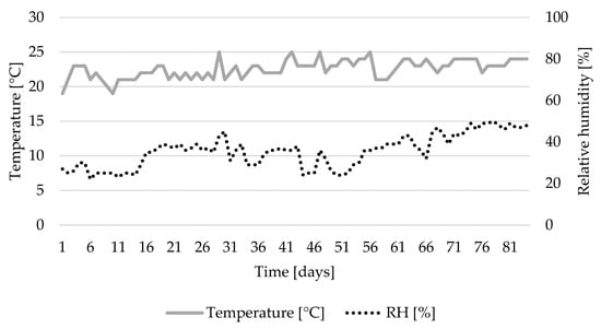 Changes in temperature and relative humidity during test time for the second group of specimens.
