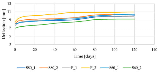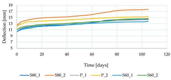 Deflection-time plots were obtained, and smooth curves were drawn through a sufficient number of experimentally obtained points in order to accurately describe the creep properties of glulam made from European hornbeam, as it is shown in Figure 5 and Figure 6 under constant loading of 0.2 and , respectively.