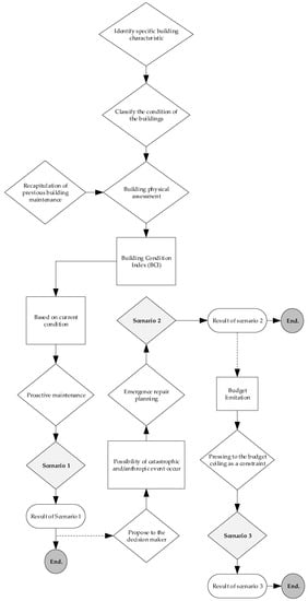 Conceptual flowchart of maintenance scheduling problem for heritage building with three scenarios.