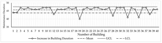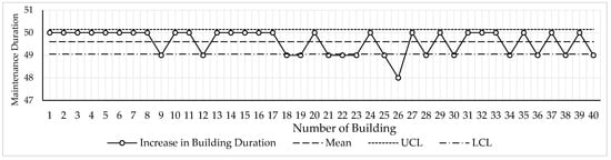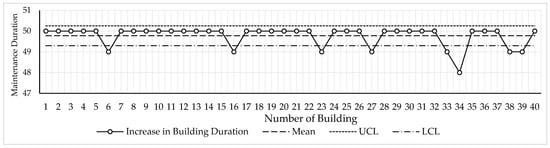 To evaluate the model’s performance regarding the distribution of costs under normal conditions, the standard deviation estimation technique is employed to assess each scenario on the graph. It is crucial to verify whether the optimization results exhibit a satisfactory distribution. A desirable outcome is indicated when the average value during the majority of the completion periods on the graph closely aligns with the maximum expected lifetime of 50 years, meeting the desired timeframe. If the graph demonstrates that more than 80% of the total building duration falls within the upper control limit (UCL) or lower control limit (LCL) range, and if it is positioned near the mean line, this indicates that the results are not significantly disordered. This suggests that the model successfully achieves a balanced distribution and allocation of the budget across each building. It is crucial to evaluate whether the results are acceptable or rejected. These findings indicate a stable long-term strategy and can be considered as a robust plan. Therefore, they can be regarded as a solid long-term plan, as each structure can be completed within the specified timeframe, as depicted in Figure 3 and Figure 4 for scenario 1, Figure 5 and Figure 6 for scenario 2, and Figure 7 and Figure 8 for scenario 3.