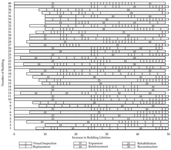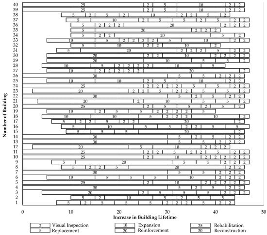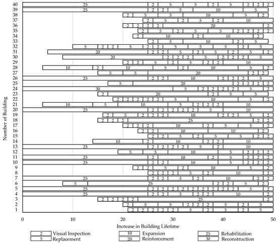 Based on the results depicted in Figure 5, it is observed that the majority of buildings fail to meet the expected lifespan of 50 years, and 85% of the total buildings fall within the range of the upper control limit (UCL) and lower control limit (LCL). This indicates that the proposed model is adept at adjusting and distributing the available budget evenly across each building. This adaptability is crucial in emergency situations in which there are budgetary restrictions. Based on the results depicted in Figure 6, it is evident that specific intervention types are required to address the deteriorated conditions of several buildings. For example, building numbers b4, b7, b13, b14, b22 and b26 necessitate reconstruction interventions, which are projected to increase their lifetimes by 30 years. Building numbers b5, b10, b11, b20, b24, b39 and b40 require rehabilitation maintenance actions to extend their lifespans by 25 years. Additionally, building numbers b9, b12, b21, b23, b29 and b30 would benefit from reinforcement actions, offering an estimated increase in their lifetimes of 20 years. For building numbers b6, b18, b19, b25, b27, b28 and b33, expansion work is essential to improve their conditions and extend their lifetimes by 10 years. Furthermore, building numbers b1, b2, b8, b9, b15, b16, b17, b31, b32, b34, b35, b36, b37 and b38 necessitate replacement actions, which are expected to increase their lifetimes by 5 years. However, it should be noted that, in order to prevent further degradation and quickly improve the BCL, repair actions are necessary, and therefore, cleaning is not included as an initial activity.
