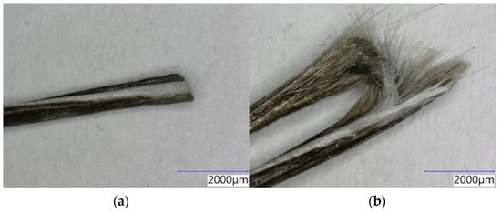 Three different mixes with and without various doses of composite basalt fibers (BFs) were designed for the experimental testing. ReforceTech supplied the basalt fibers, MiniBars, used in this study. Each single MiniBar composite BF is a bundle of basalt microfilaments (forming thread) impregnated by a polymeric matrix. Composite fiber’s mechanical behavior in concrete was investigated by Lukasenoks A. et al. [] and Macanovskis A. et al. []. Fibers show competitive properties compared with metal fibers, and interest in them is rapidly growing []. The length of fibers was 43 mm, double the length of the maximum aggregate size used in the mixes to ensure a bridging effect. The fibers have a diameter of 0.70 mm, density of 2000 ± 100 kg · m−3, min value of modulus of elasticity 42 GPa, and min tensile strength of 1000 MPa [], see Figure 2.