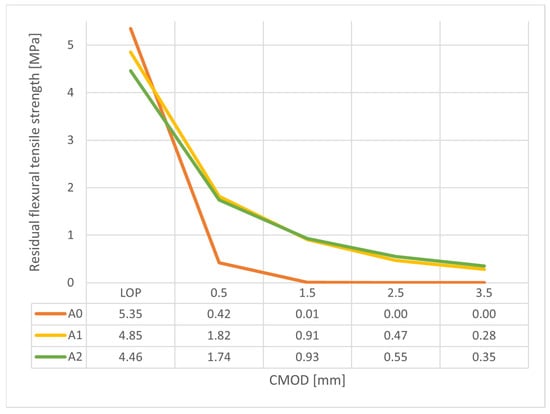 The load at the limit of proportionality was 17.4 kN for mix A0, 15.8 kN for mix A1, and 14.1 kN for mix A2. The concrete mix A1 with 6.7 kg of BFs, performed similarly to mix A2, which contains more 4.1 kg of BFs. Furthermore, the residual flexural tensile strength of mixes with BFs was comparable with the maximum reach tensile strength that was better for A1 (see Figure 3). This might be due to better fiber distribution in a sufficient amount of matrix. Higher doses of fiber can result in uneven distribution and a lack of matrix in which the fibers can be bonded.